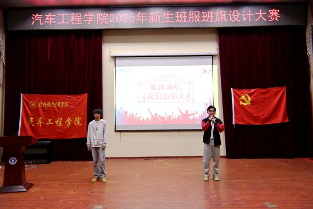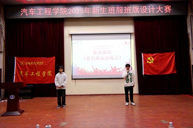 中场环节精彩纷呈,文艺表演《我们的明天》用悠扬的歌声传递着新生对未来的憧憬与期许,赢得全场阵阵掌声;趣味互动游戏则让现场气氛持续升温,同学们积极参与、默契配合,在轻松愉悦的氛围中增进了彼此情谊。工作人员同步紧张统计分数,及时向现场师生公布各批次展示班级的得分情况,让比赛进程透明公开。随后,4-7号、8-10号班级陆续完成展示,各班级作品各具特色、亮点纷呈:有的以简约大气的设计彰显工科生的沉稳严谨,有的用活力鲜明的色彩展现青春朝气,有的将汽车零件、学院标识等元素融入设计,凸显专业特色与集体认同。文艺表演《看得最远的地方》再次点燃现场氛围,舒缓的旋律与真挚的演唱为比赛增添了温馨感人的色彩。
