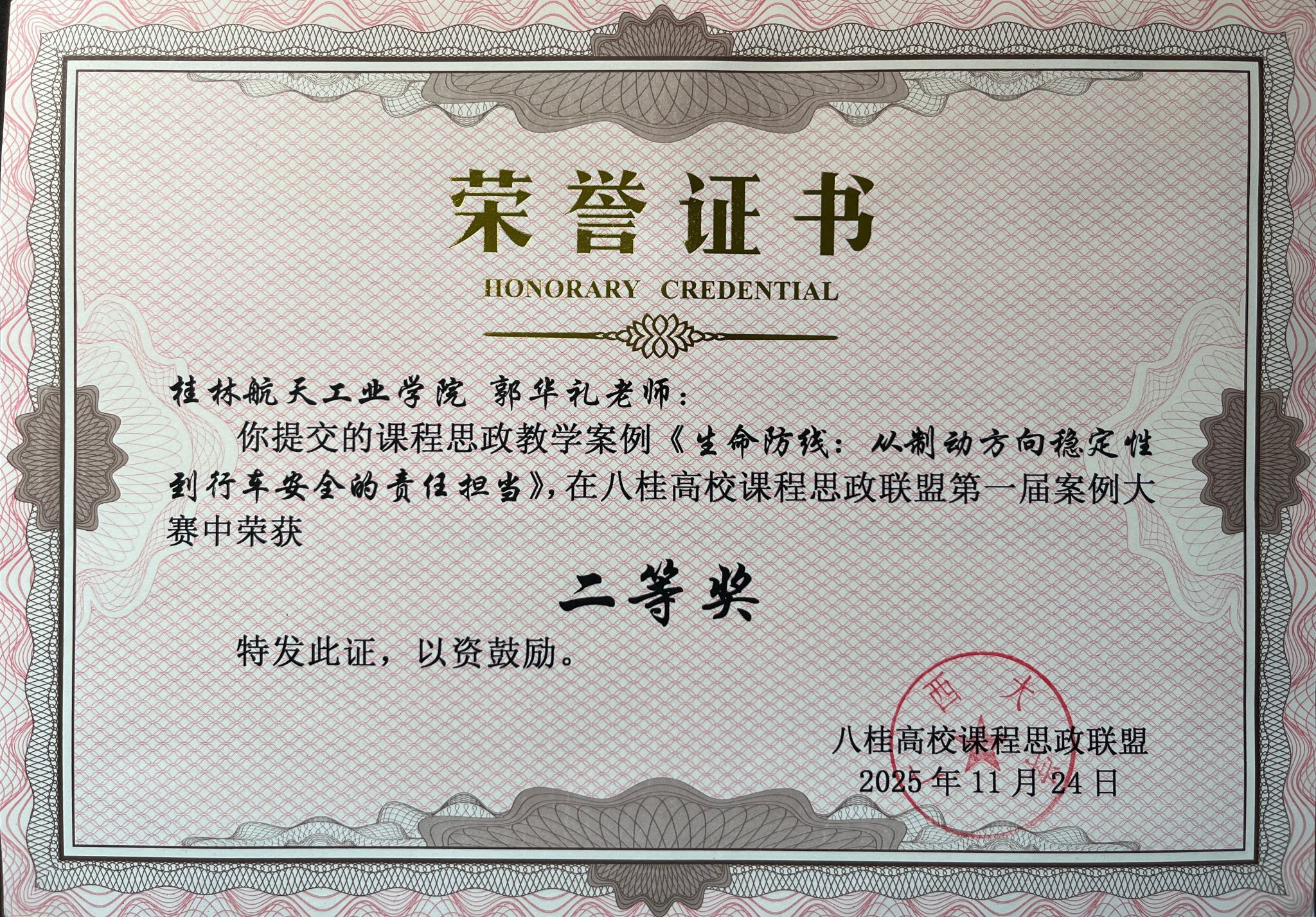 郭华礼老师的案例《生命防线:从制动方向稳定性到行车安全的责任担当》荣获二等奖。